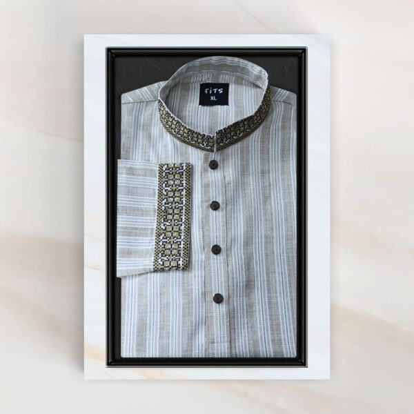 Brown and Off White Striped Fits Men’s Panjabi With Collar and Cuff Embroidery.