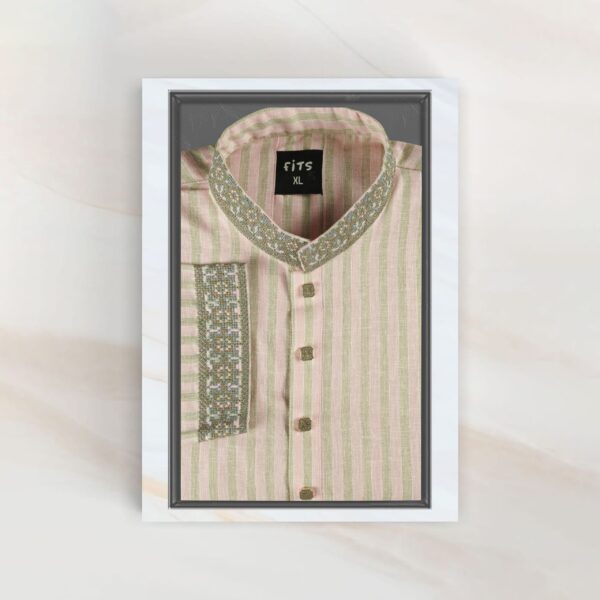 Pink and Ash Striped Fits Men’s Panjabi With Collar and Cuff Embroidery.