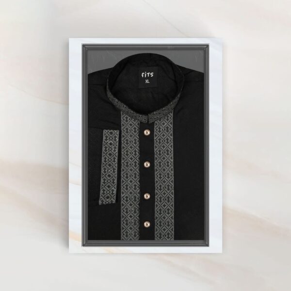 Silky Black Fits Men’s Panjabi With Collar, Cuff and Chest Embroidery